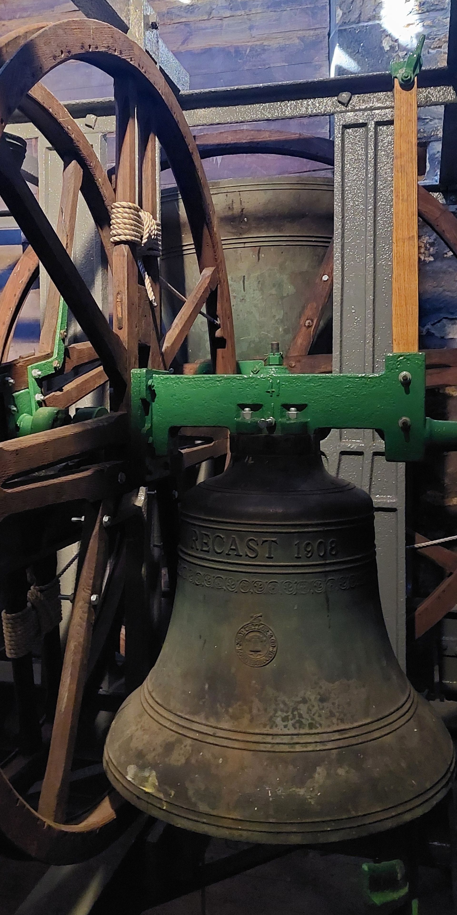 Image (1) shows the treble bell with its wheel and fittings in its ‘down’ or resting position. The tenor is visible in the background, ‘raised’ and ready to ring. Image (2) is the same view, but shows the shocking state of the frame and fittings before the repairs and renovations done in 2025 by Blyth & Co. Compare the size of those two bells at the bottom of Image (4) (with apologies for the 120 years’ worth of dust on the inaccessible lifting beams!)