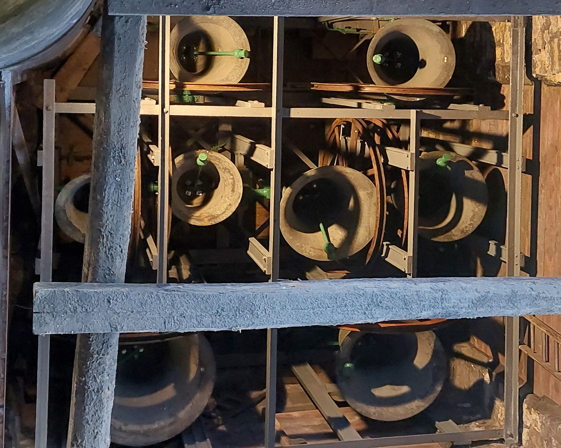 Image (4) is a view of all the bells from above with their mouths uppermost, i.e. ready to ring. This is the starting position for ringing bells in the traditional English art of change ringing, which dates back to the 17th century. During this process the bells are rotated backwards and forwards through 360 degrees. (It is the time taken for each bell to rotate that prevents tunes being rung.) Controlling a bell requires skill on the part of the ringer rather than brute strength, the challenge being to get the rhythm as even as possible. In addition, each ringer has to memorise the pattern of the changes through which to navigate the bell.